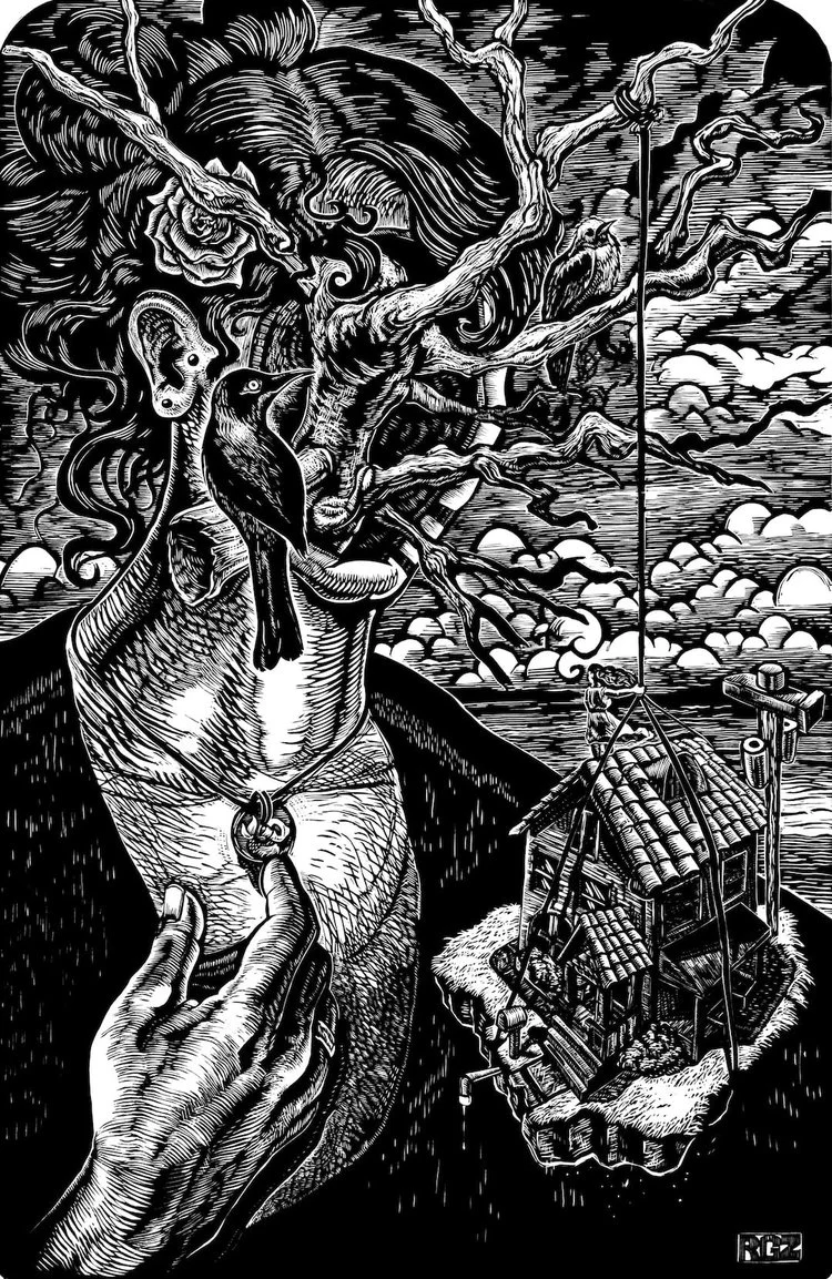 Zambrano went on to study art in undergrad, but it wasn’t until graduate school that he was introduced to and fell in love with printmaking. It was 2014, he was studying at the University of Idaho in Moscow, and making large-scale charcoal drawings. A fellow student named Tim Han asked him if he had ever tried printmaking, as Han could see that Zambrano was interested in creating a graphic quality to his art works. Han showed Zambrano beautiful Korean woodblock prints, which he had brought with him from Korea. Zambrano was completely taken with the images and tried his own hand at the practice. From there it was only a matter of time before Zambrano experienced his first magical moment seeing the paper separated from the block. He was hooked for life.
