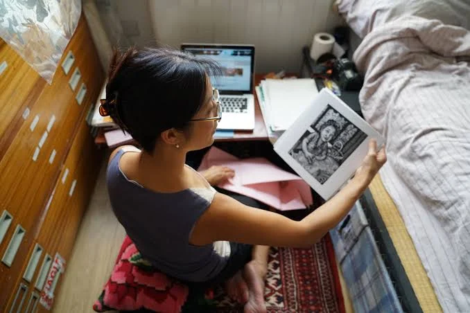Her latest body of 65 prints was made for just one person, her father, though in this age of social media her audience has been greatly expanded by Instagram and Facebook. The working title for these prints was “Diary Prints” (2016–18) and had strict parameters: each measures 15 x 20 cm (6 by 8 inches) with a maximum of two colours, and were to be made quickly, at a pace of an image every fortnight or so. Many of these prints are little vignettes, and her presence, implied or actual, is in almost every scene. To understand how she came to make these prints, one needs to know about a film she was making in art school, “Stoke Junkie”. Having enrolled at the Royal College of Art as a mature student in 2013, she wanted to make a film to learn new techniques. Being aware that in the UK one hardly ever sees elderly non-white people in the media, she decided to turn the gaze towards her own parents. Beyond this interest in their representation, Ho has a clear love and admiration for her mother and father and their unique points of view. Her dad at the time was still a bodybuilder at the age of 75, and her mother an outspoken, playful tai chi practitioner, who builds elaborate scaffolding for her beloved “Queen of the Night” flower out of curtains and coat hangers. Her mother’s health had been declining for the past six or seven years and her father had recently retired to take care of her. During this time, her mother would often joke that, tired of living, she was going to find a drug dealer in Oxford who could give her enough cannabis to overdose (despite Ho’s gentle insistence that she’s pretty sure that’s not how it works). Their wonderful irreverence and dark humor was supposed to be the subject of the film but it turned out to be quite different. In the midst of making the film, one Saturday morning, while her father was out jogging, he tripped on the root of a tree, fell against it, and broke his neck. Since then he hasn’t been able to stand or walk. The after affects of this sudden and unthinkable change to all their lives is captured through the film and the finished piece can be seen in its entirety on her website. [link] She speaks quite beautifully about the power that filming had to displace some of the emotions she was going through watching her parents navigate this most unexpected tragedy. She says “[The act of] making is a good way to stepping into the moment, and forgetting about the future or the past.” Through filming, she could be completely focused on what they were saying or doing, and put aside sadness and fear.
